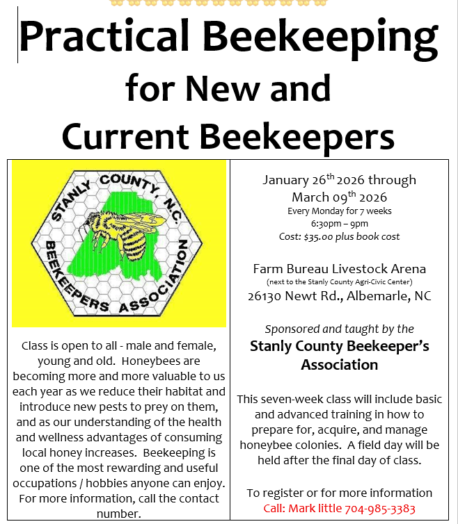 | January Meeting: Thursday, Jan. 8th @ 6pm. (Stanly County Farm Bureau Livestock Arena) Our January SCBA meeting will be held on Thursday, January 8, 2026. A delicious meal will be served starting at 6 PM. The meal will be followed at 7 PM by a short business meeting and presentation by Tara Lynne Groth on “What Natural Beekeeping Means to You”. What’s “natural” exactly? “Natural” is one of the most misunderstood terms in food labels, and misconceptions carryover to beekeeping too. Hands-off beekeeping, chemical-free beekeeping, tree hives v. Langstroth hives, comb production–we all have different ideas about natural hive management. Learn about the many perceptions of natural beekeeping, the Certified Naturally Grown program, and how your interpretation can help your hives. Former president of the Chatham Beekeepers Association, Tara Lynne Groth speaks about natural beekeeping, agricultural marketing, and permaculture design. Before keeping bees she was a public relations director and a marketing manager. As an agro-journalist, she has written for VEGETABLE GROWERS NEWS, GRIT, PRODUCE BUSINESS NEWS, and dozens of other publications. She’s been keeping bees since 2017 and became a journeyman beekeeper in 2021. She manages two chemical-free apiaries, one in Pittsboro and another near Bryson City, North Carolina. Passionate about ecological living, Tara Lynne studied permaculture through Oregon State University. She received her permaculture design certificate from OSU in 2021. Applying sustainable principles to her landscapes has boosted biodiversity and created more resources for honeybees, native pollinators, and wildlife. Some of her projects include a no-dig pond garden and an apple orchard food forest. Her apiary is a Certified Wildlife Habitat and a designated spot on the North Carolina Butterfly Highway. Tara Lynne’s writing has been professionally recognized for more than 20 years. She’s published a handful of books, features her poetry on her honey jars, and has helped small businesses to global brands tell their stories. We look forward to seeing you all in the new year. Things to do in the new year from our Stanly County Beekeepers Association beekeeping calendar: January ~Add pollen supplements, if needed; check amount and location of honey stores, and feed (2:1 syrup, candy board or fondant) if <3/4 super of stored honey left.` ~Check/repair/replace stored equipment; order wax/woodenware. ~Consider single dose of oxalic acid vapor or drizzle early in Jan. to clean up residual varroa in hives. ~Order nucs/packages. ~Keep learning—beekeeping class, read books/journals, etc. ~Combine or insulate smaller (less than 4 frames of bees) hives. ~Combine hives where queen has failed, if they’re still alive and haven’t absconded. ~Move hives if they’ll need to be relocated this year. ~Bees may need help removing dead bodies and/or heavy snow from entrance area. |