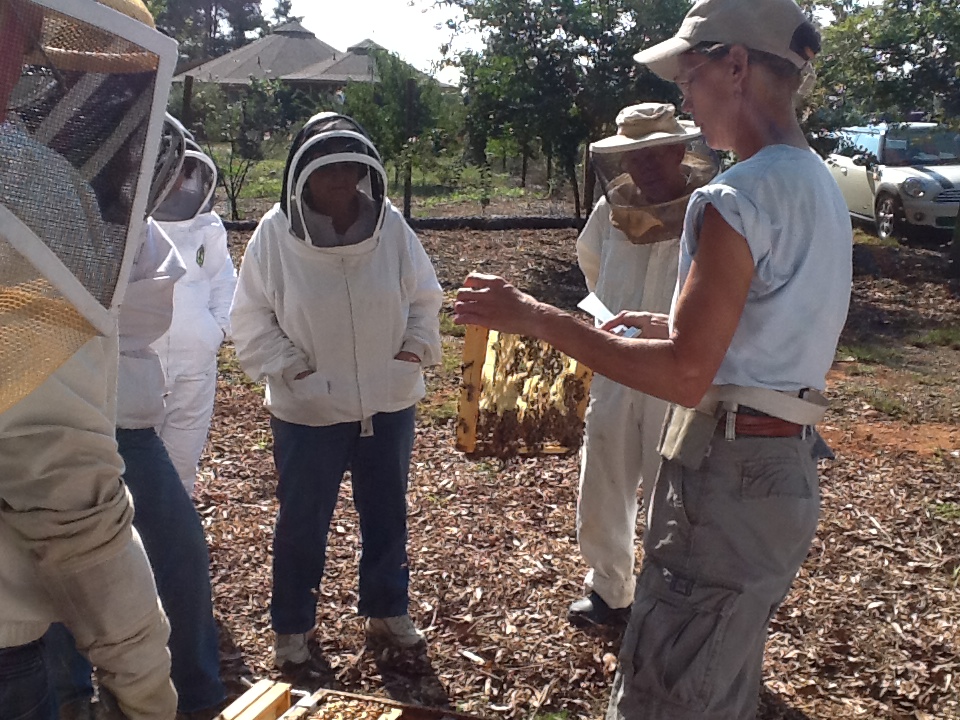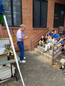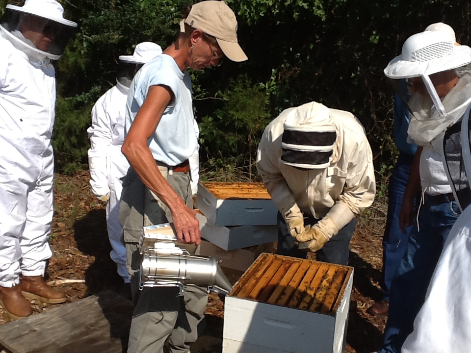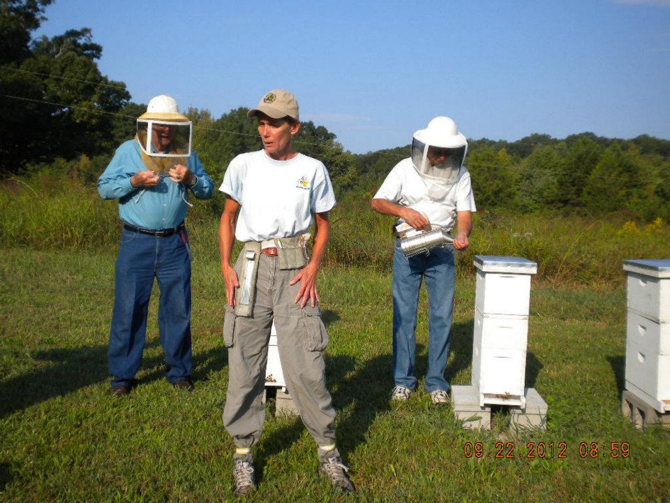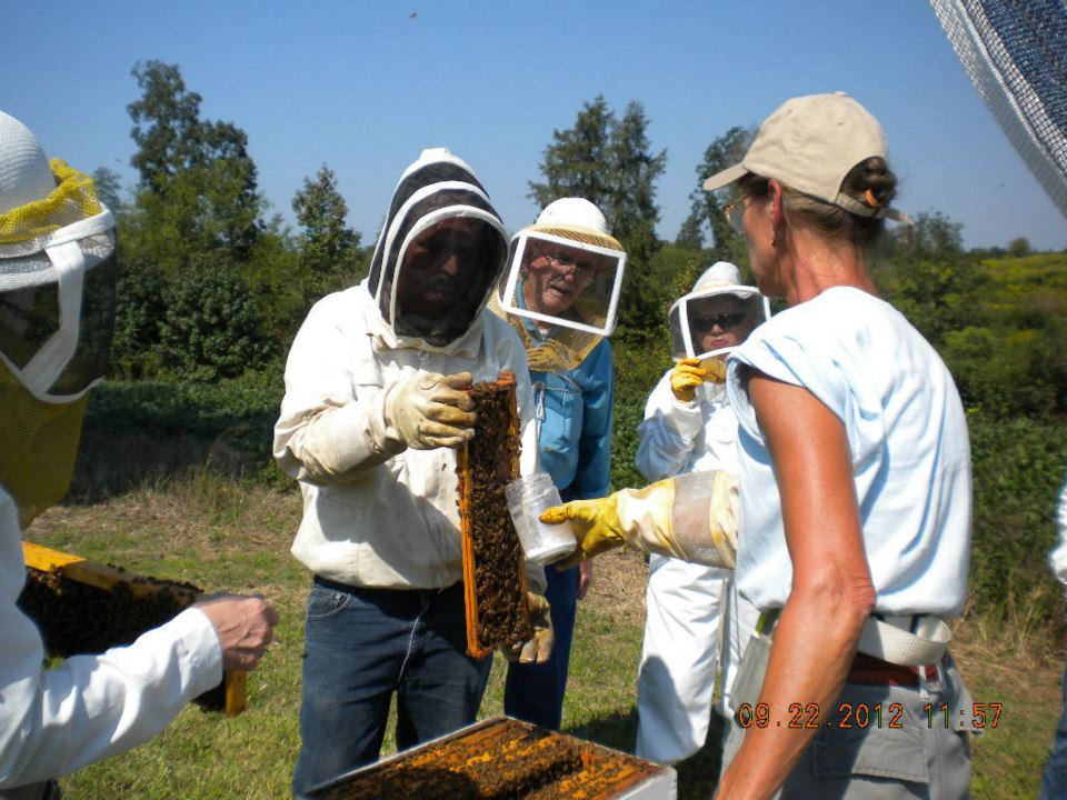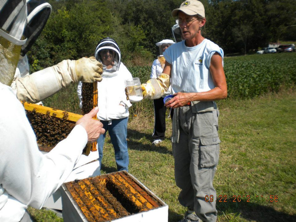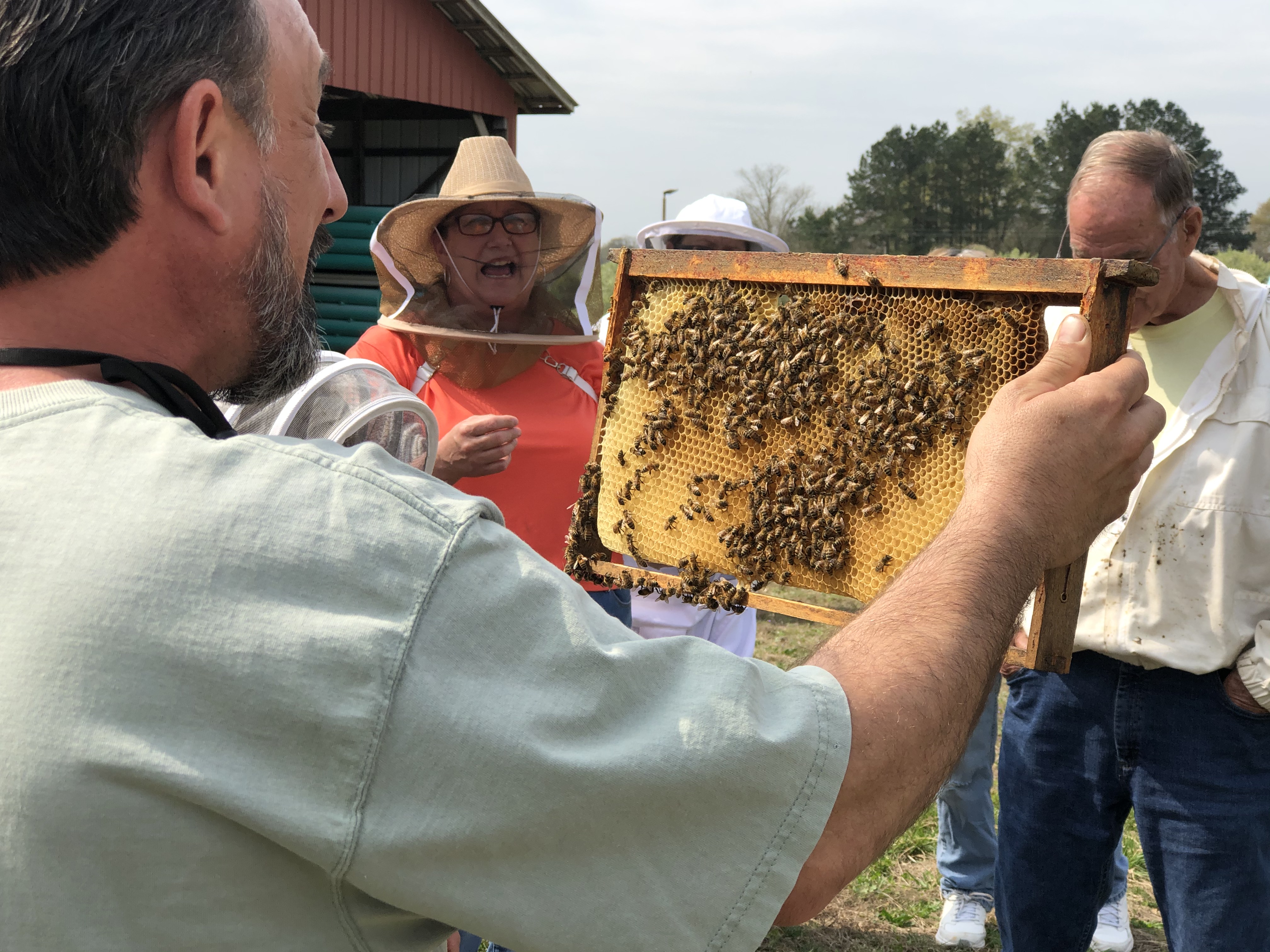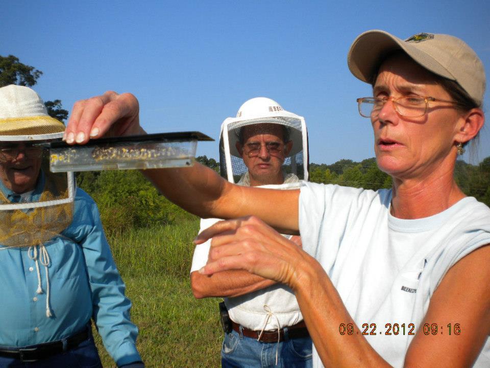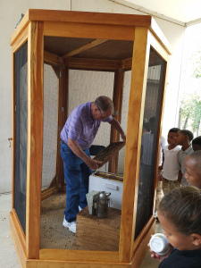 Bill Smith in the bee cage showing students parts of the hiveBrad Hartsell showing students a Queen beeBill Smith teaching students about the Honey Bee