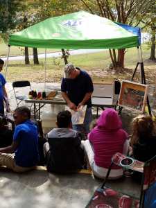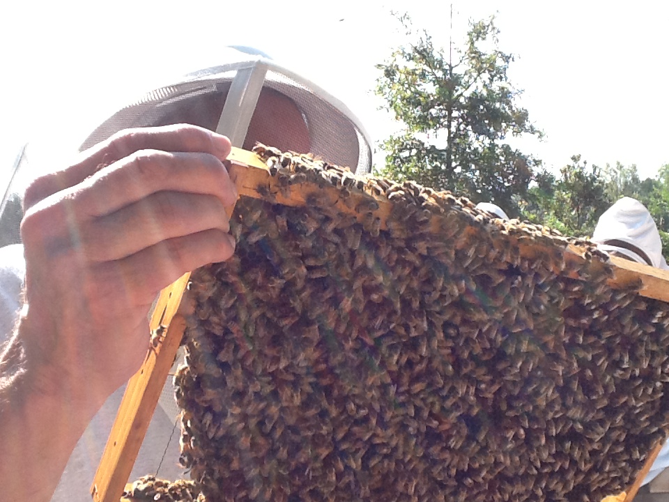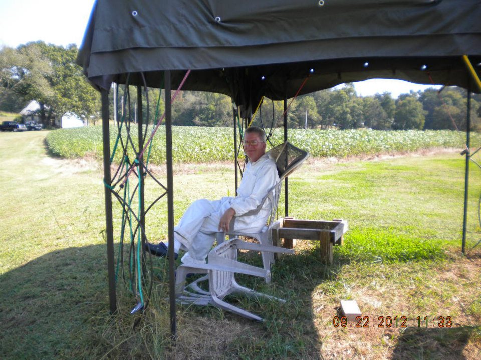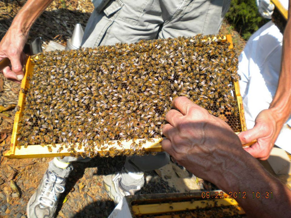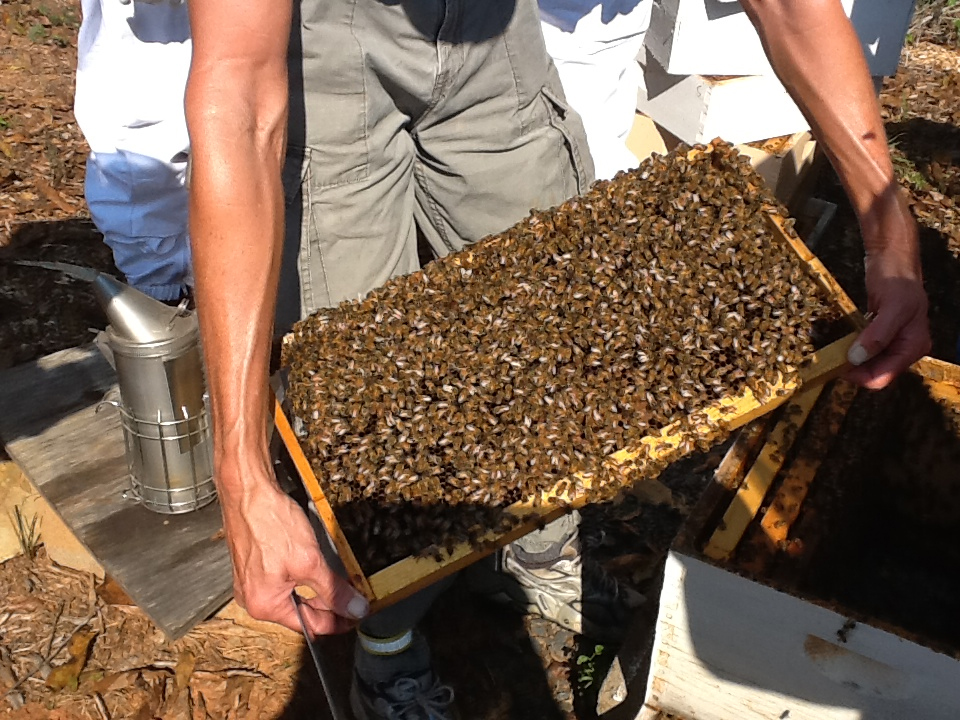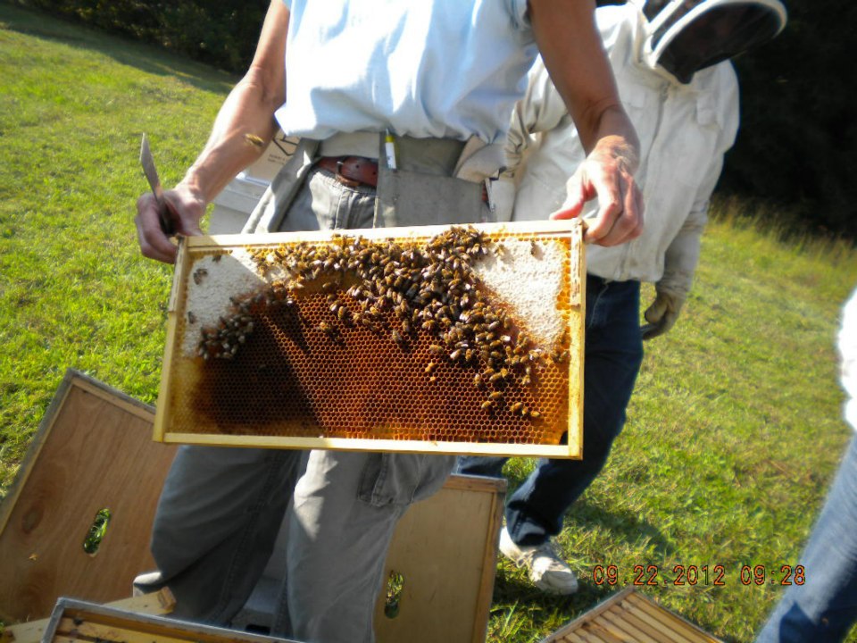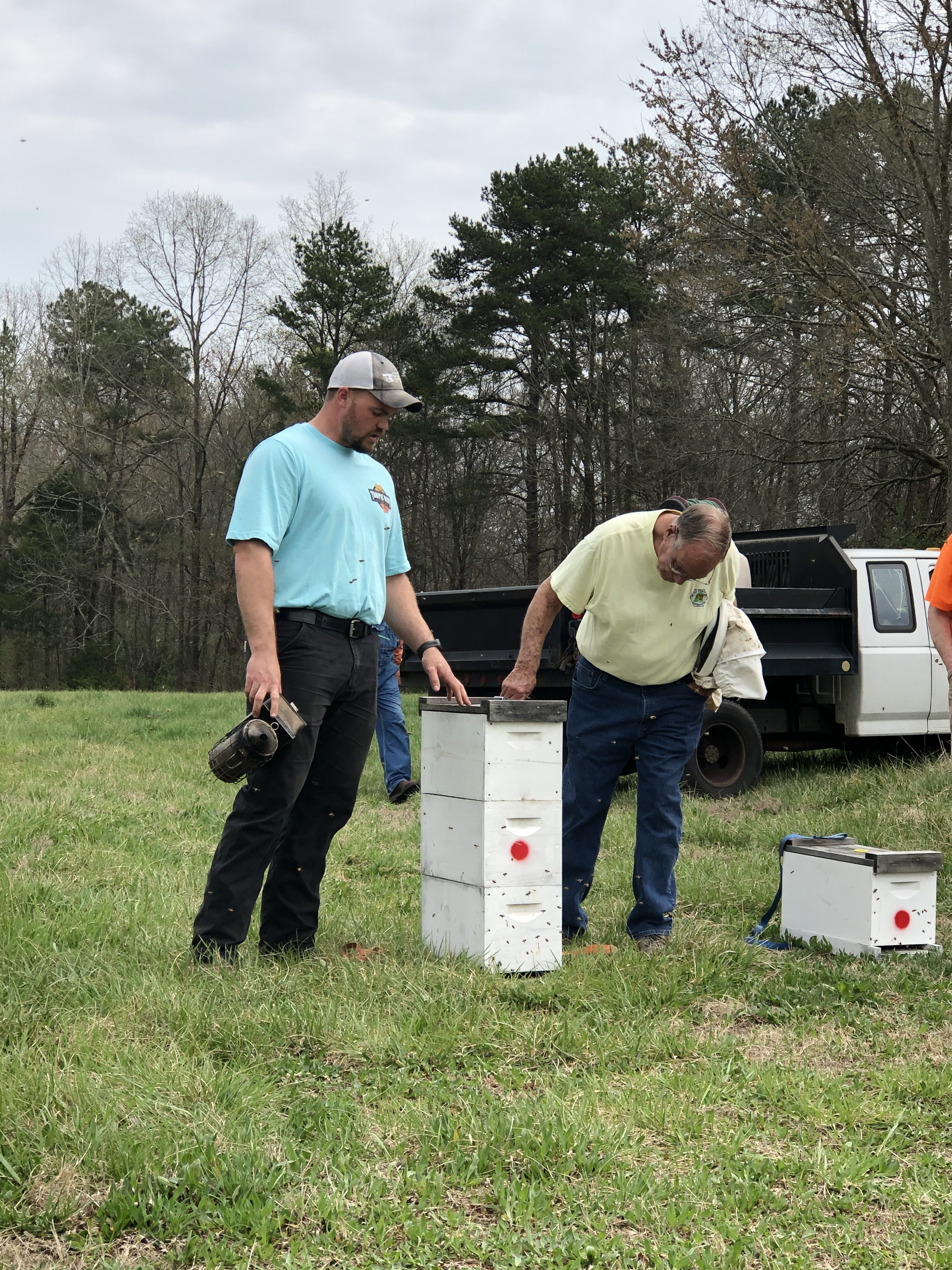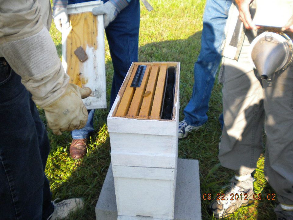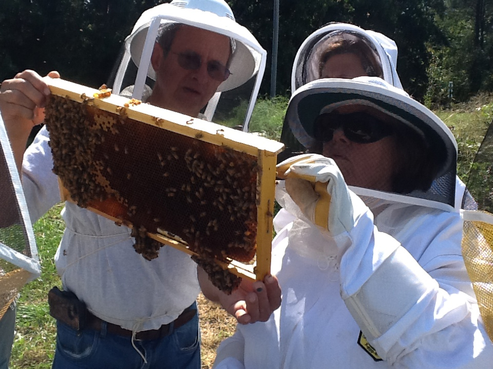 Bill Smith in the bee cage showing students parts of the hiveBrad Hartsell showing students a Queen beeBill Smith teaching students about the Honey Bee
